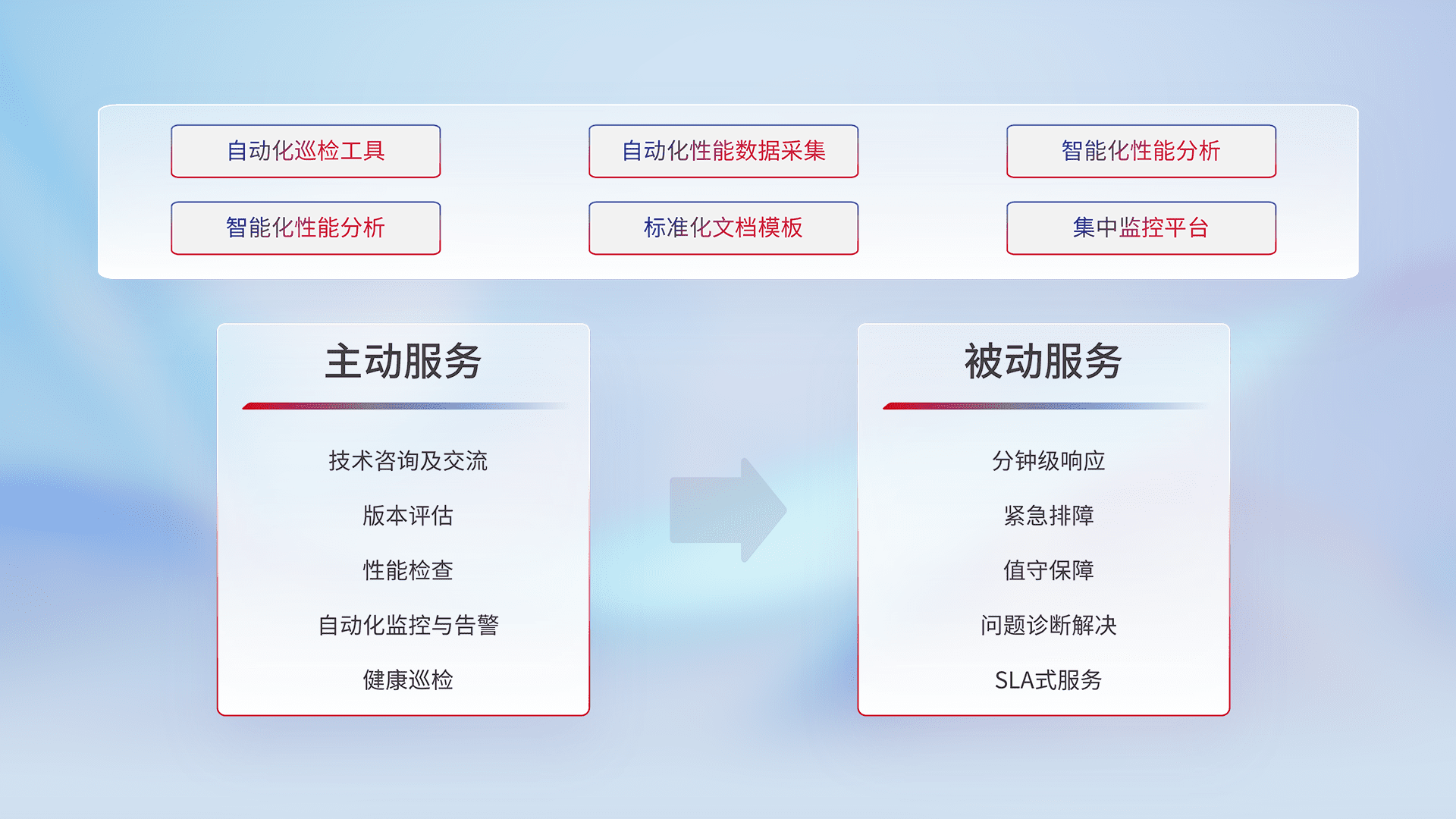 智能化工具和标准化文档,,,,保障服务质量,,,,提供主动服务(包含技术咨询、、、、版本评估、、性能检查、、、自动化监控与告警、、、健康巡检)和被动服务包含(分钟级响应、、、紧急排障、、、、值守保障、、问题诊断解决、、SLA服务)。。。